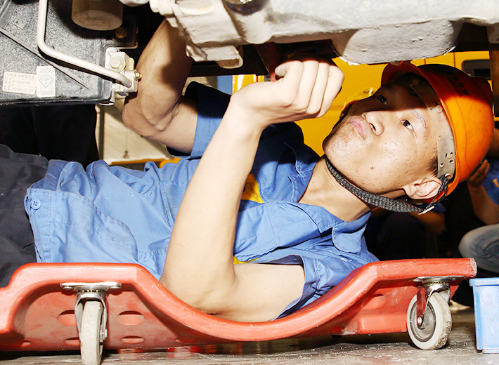 走進裝配車間,你也許很難發(fā)現(xiàn)蔡聰?shù)纳碛?,因為他的工作是安裝取力器,需要長時間的在車底作業(yè)。